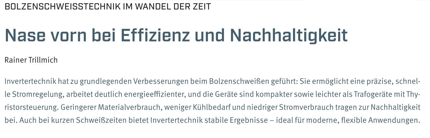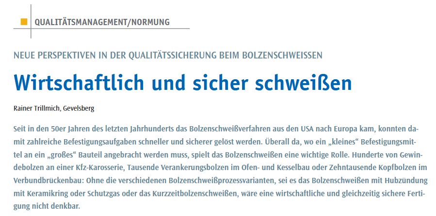 Gerade im "geregelten Bereich" wird oft ein Nachweis der Schweißqualität verlangt. Mit modernen Bolzenschweißgeräten der Serie PRO-I und Pistolen der Serie GD (Hersteller Bolte GmbH) ist das einfach und sicher. Hier erhalten Sie nähere Informationen.