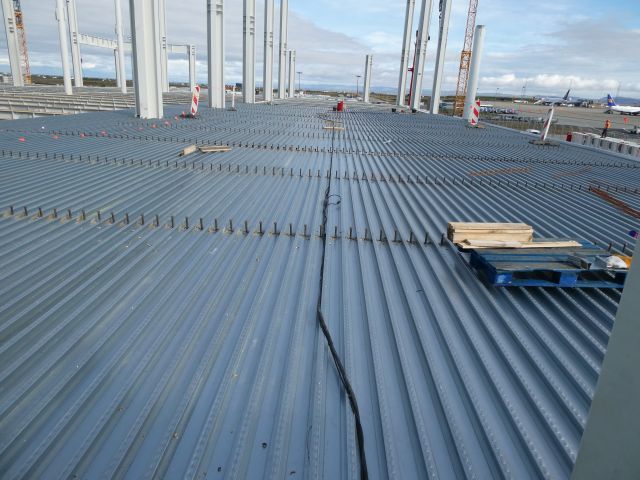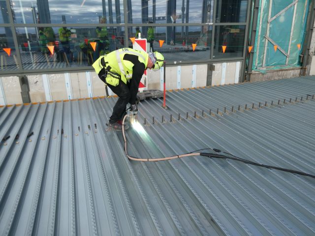 Die Kopfbolzen (SB-Bolzen 22 x 150 und 22 x 200 der Fa. Bolte GmbH) wurden nach dem sorgfältigen Vorbereiten der Oberfläche durch Schleifen von qualifiziertem Personal (Bedienerprüfung nach DIN EN ISO 14732) geschweißt. Oft sind die Bolzen in der Nähe des Bauteilrandes platziert, hier ist besondere Erfahrung nötig, um die sog. magnetische Blaswirkung auszugleichen und einen geschlossenen Schweißwulst zu gewährleisten.